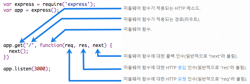 파라미터 안에 들어가는 req, res는 거의 항상 req, res로 표현하지만 콜백함수 매개변수에 의해 이름이 결정된다.